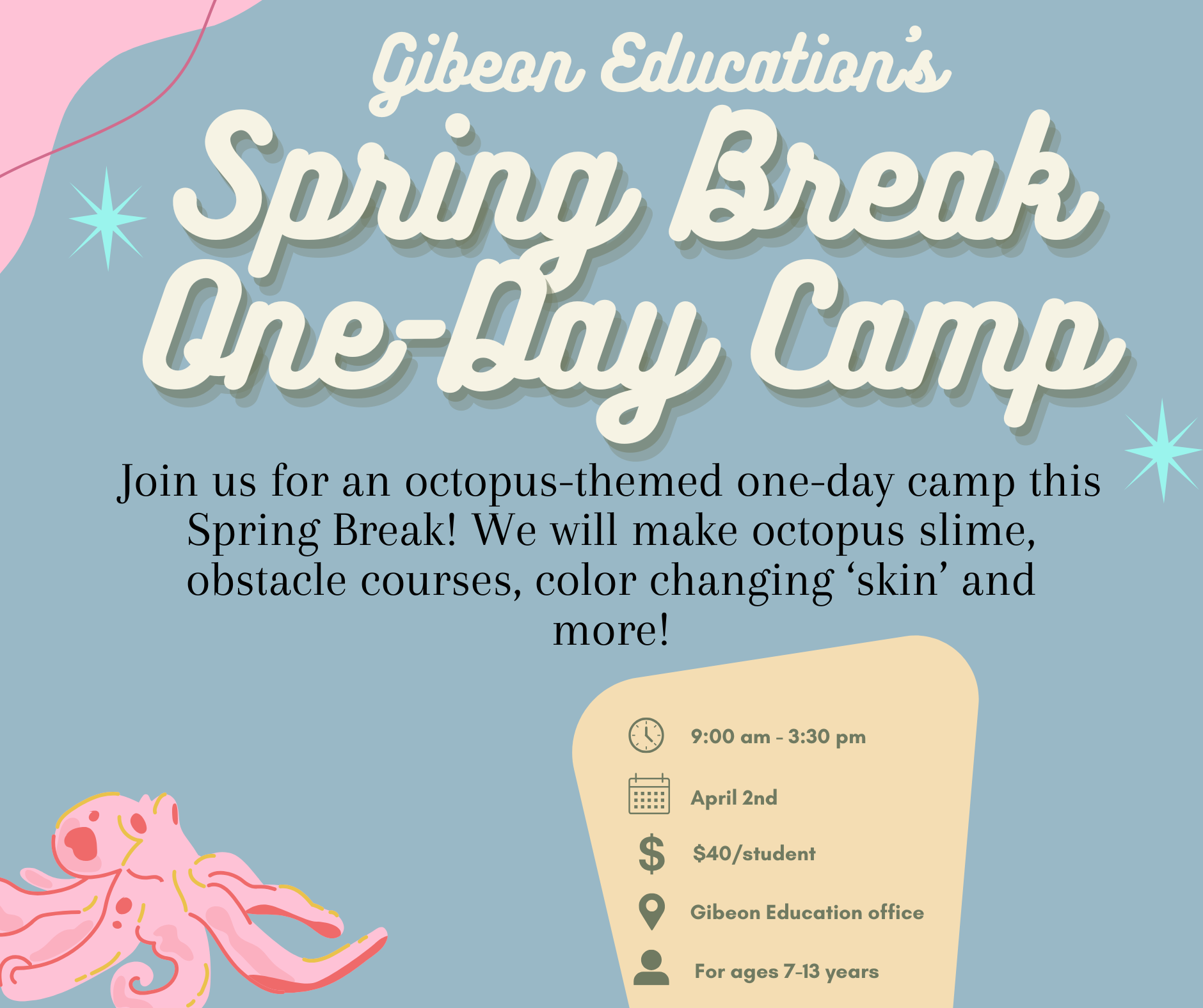 Join us for one day of Spring Break activities, experiments, competitions, and crafts! The theme for the day will be octopuses (or is it octopi? Octopodes?)!